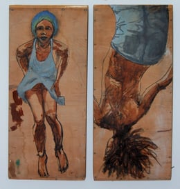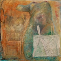 Verschiedenste Variationen von Tuch werden als Leinwand genutzt - zusammengenähte Leinentücher, Tischdecken aus grobem Tuch, Kaffeesäcke, alte Kopfkissenbezüge mit Klöppelspitze.....